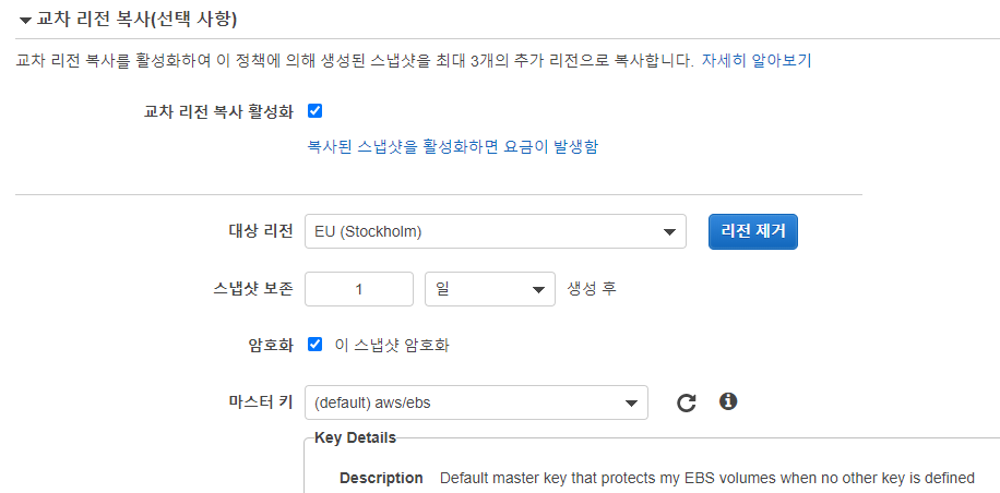 - 주기 : 백업 라이프사이클 통하면 기존 스냅샷과 동일한 주기로 진행됨 (보존기간만 별도로 지정 가능)