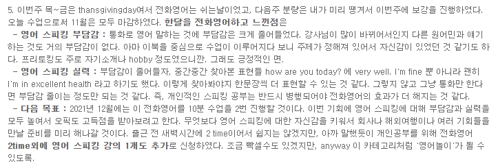 | [YBM 10분 전화영어] 20211123 - 20Day (2 class) (0) | 2021.11.23 |