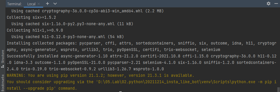 You should consider upgrading via the 'D:\05.Lab\02.python\20211214_insta_like_bot\venv\Scripts\python.exe -m pip i