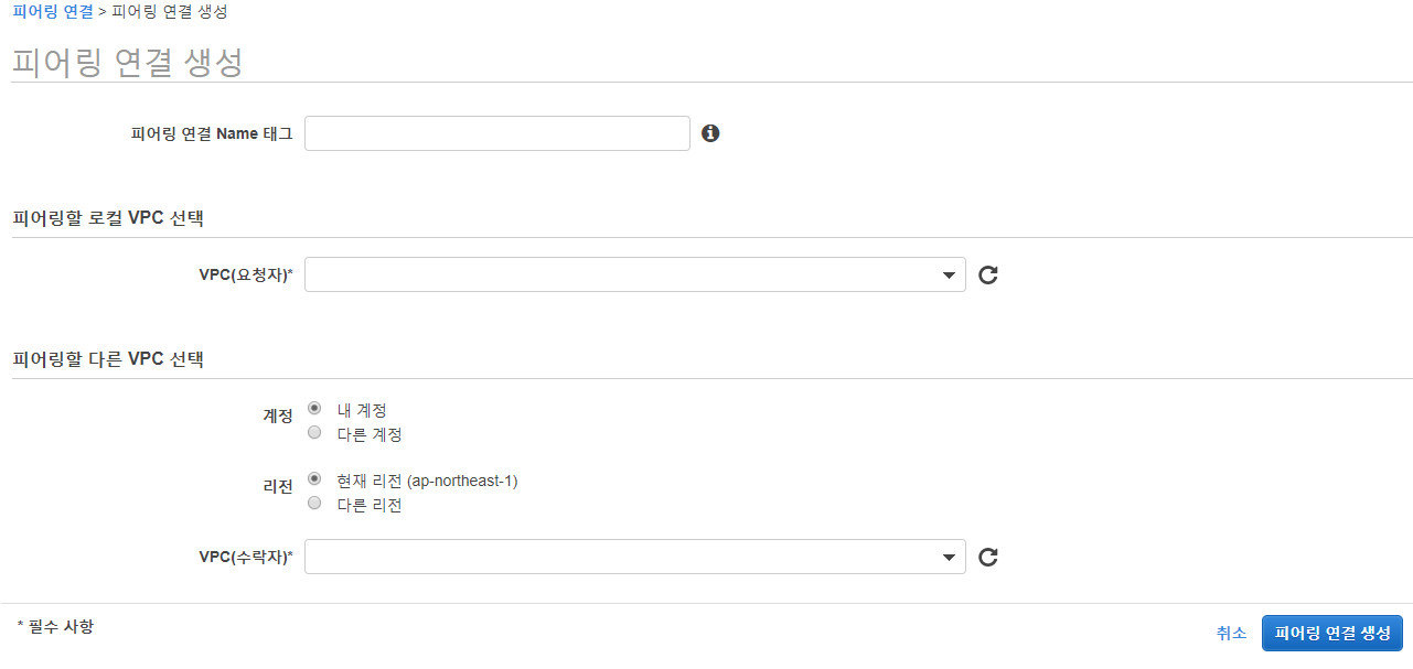 서비스 > VPC > 피어링 연결 > '피어링 연결생성' 클릭 > '피어링 연결생성' 양식 기입 > '피어링 연결생성' 클릭